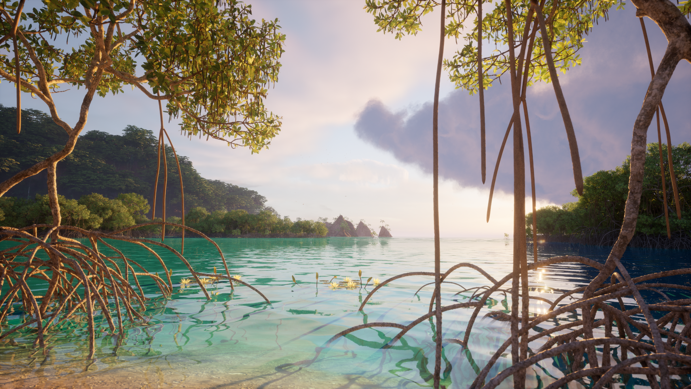 In my search for assets I quickly found the really good ‘Tropical Jungle Pack’ by Kaizen Digital Interactive in the Unreal Engine Marketplace with optimized Nanite jungle trees in the pack ready to be used. However finding good mangrove trees appeared to be a bigger challenge, as most asset packs were either limited to a single tree or not prepared for use in game engines. Eventually I went for the beautiful ‘Mangroves 2.0 3D Model’ by Robert de Wit on TurboSquid, but every tree needed manual preparation for real-time from a humongous Maya scene and a complete material rebuild in Unreal as well. For the rest of the assets I mostly relied on the Quixel Megascans Library.