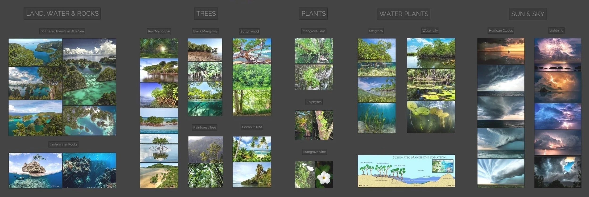 The second part of my research was to get a clear overview of what type of assets (especially trees and plants) would be needed exactly to build my environment. I organized my references in a separate asset reference board and made a clear distinction between must-have and nice-to-have assets.
